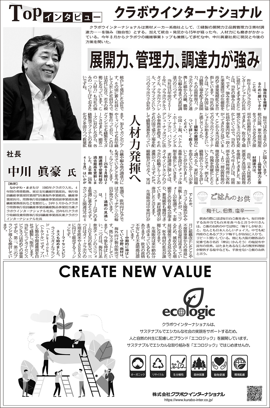 繊維ニュース10月27日号に、弊社中川眞豪社長のインタビュー記事が掲載されました。