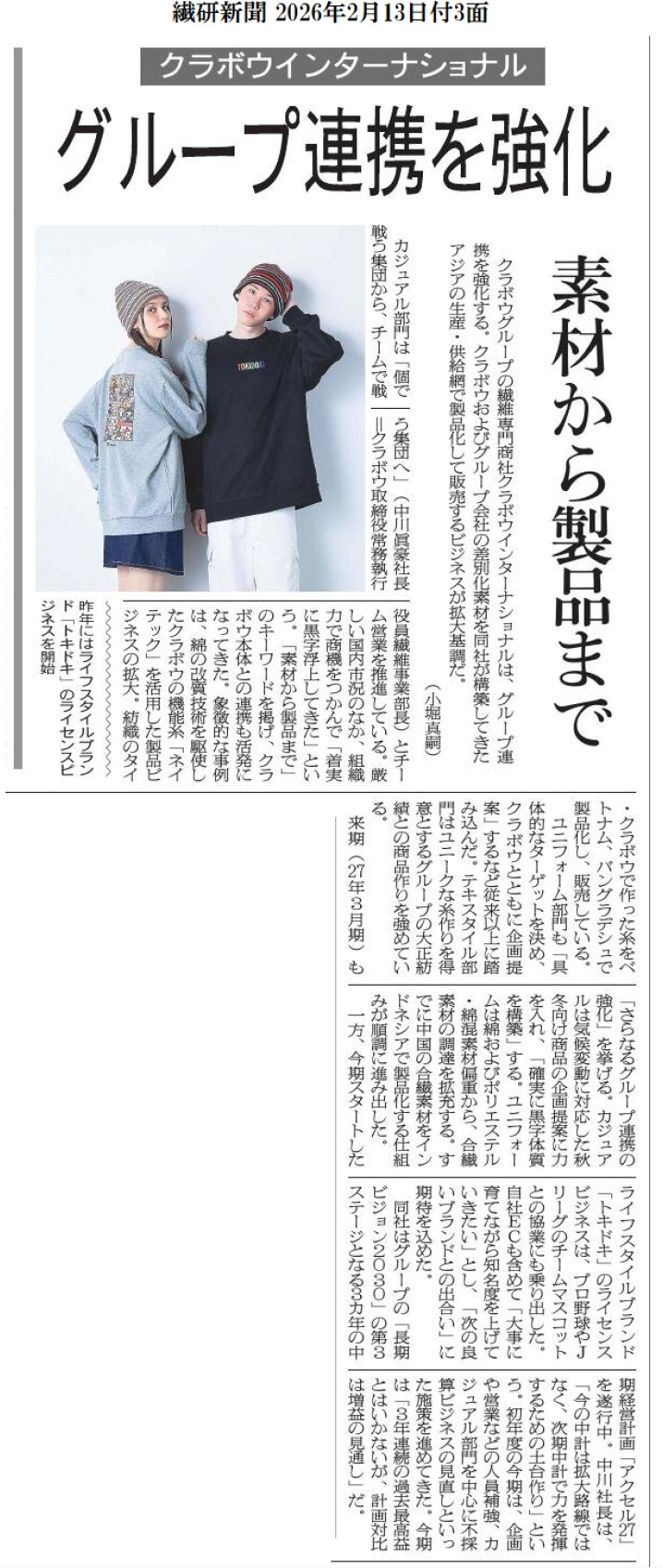 繊研新聞2月16日号に、弊社中川眞豪社長のインタビュー記事が掲載されました。